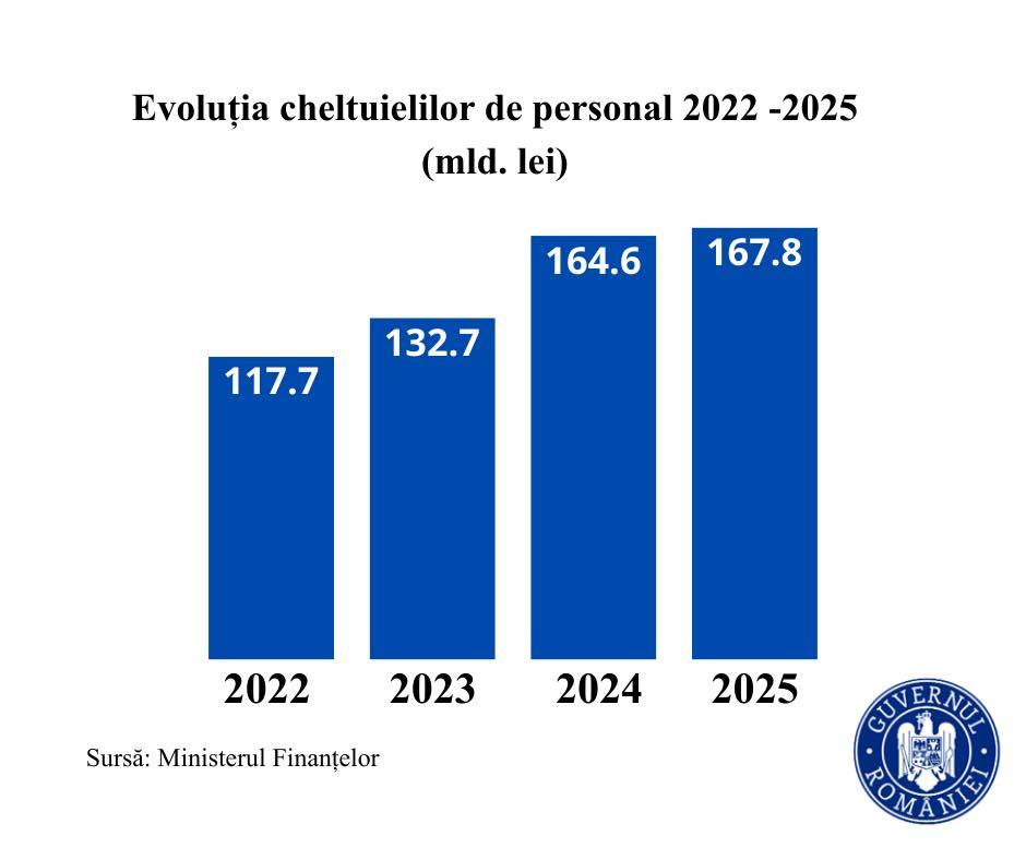 Trebuie precizat că guvernul Ciolacu 1 (coaliția PSD-PNL), înlocuit în decembrie 2024 de guvernul Cioalcu 2 (PSD-PNL-UDMR), a majorat în 2024 salariile începând cam de la mijlocul anului, după care pentru 2025 le-a înghețat la nivel de noiembrie 2024. Astfel, cheltuiala salarială din primul semestru din 2025 arată o creștere considerabilă, baza din prima jumătate a anului 2024 fiind una mai redusă.