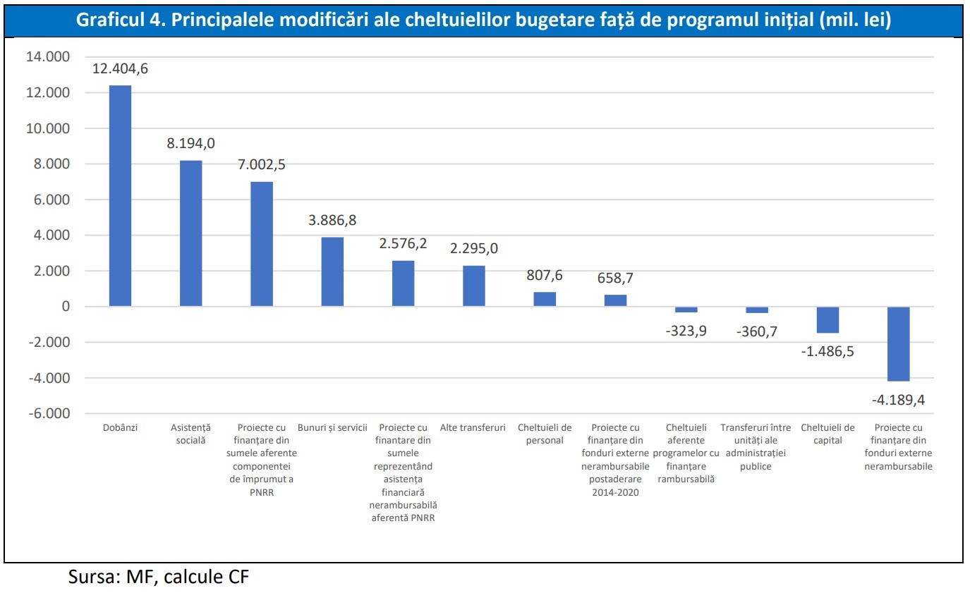 - Cheltuielile cu dobânzile cresc cu 12,09 miliarde lei;
