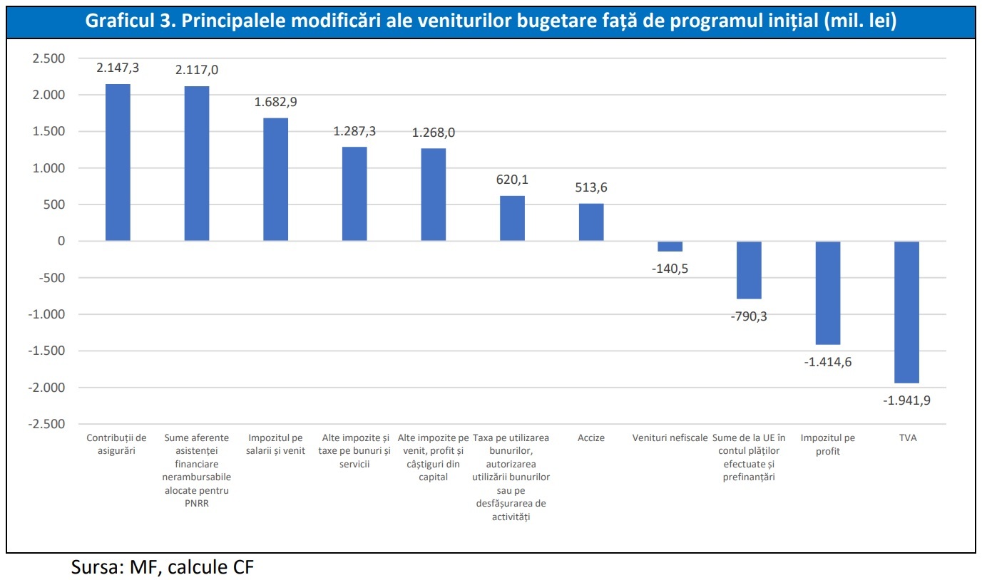 Pierd bani în principal Ministerul Investițiilor și Proiectelor Europene - 3,25 miliarde lei, Ministerul Sănătății -2,66 miliarde lei și Ministerul Transporturilor și Infrastructurii: -1,85 miliarde lei.